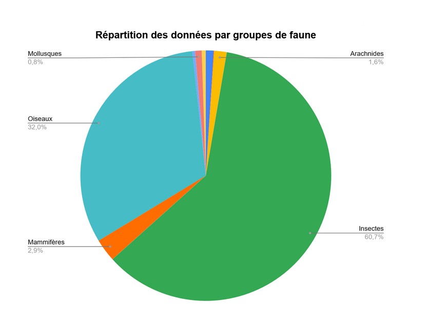 Parmi ces observations, 225 d’entre elles sont patrimoniales, pour 67 espèces différentes (3 amphibiens, 19 insectes, 3 mammifères et 41 oiseaux)