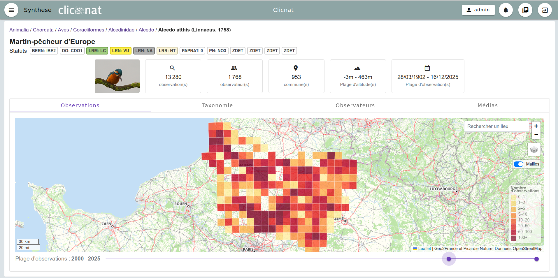 Ajoutées dans la version 2.15 et améliorées dans la version 2.16, les Fiches taxon font leur apparition dans GeoNature. Elles centralisent toutes les informations disponibles dans Clicnat au sujet d’un taxon : mailles de présence, statuts taxonomiques, liste des observateurs, et médias.