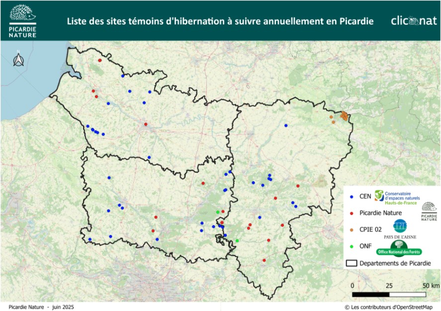 Initialement, 70 sites témoins d’hibernation ont été définis en concertation avec les partenaires, fin 2023, la nouvelle liste affiche 52 sites ou groupes de sites prioritaires à suivre. On retrouve 20 sites dans l’Aisne, 21 pour l’Oise et 11 en Somme (voir carte), Picardie Nature suit 16 de ces sites.