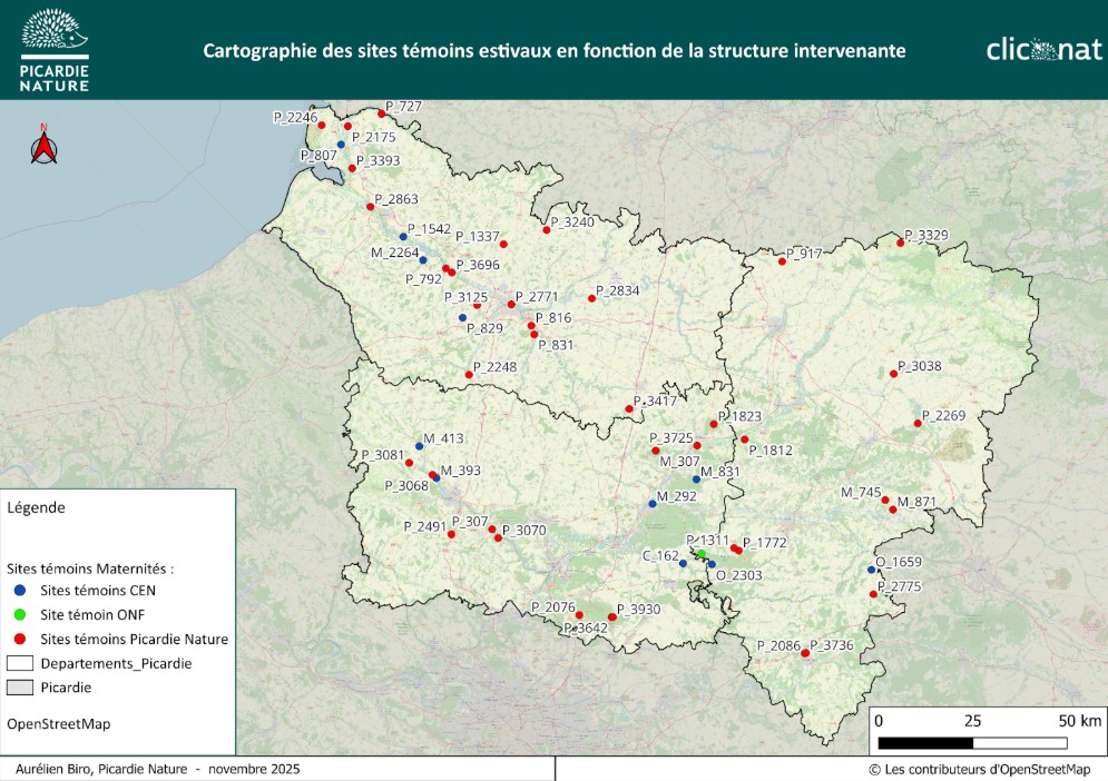 En collaboration avec le CEN des Hauts-de-France et l’ONF, Picardie nature avait sélectionné 47 sites témoins en 2023, à suivre chaque été. Cette liste a été modifiée à l’automne 2023, afin de garder des sites prioritaires accessibles et inventoriables dans le temps. La liste validée en CSRPN (Conseil Scientifique Régional du Patrimoine Naturel), en novembre 2024 présente 49 gîtes d’été ou groupe de gîtes. Picardie Nature suit 30 de ces sites. La sélection des sites s’est basée sur une focalisation en fonction de l’espèce (Pipistrelle commune, Sérotine commune, Murin de Daubenton, Petit rhinolophe, Murin à moustache, Murin de Natterer, Oreillard gris, …). Mais également sur une diversité de type de sites (maison ancienne, récente, château, grange, cavités, …).