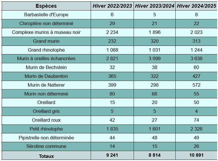 Pour cela, en 2022 et 2023, une première liste de sites témoins d’hibernation et de maternités a été définie en concertation avec les partenaires et un premier suivi de ces sites a été réalisé. Suite à ces suivis, la liste sera affinée fin 2023. Cette liste correspond à des sites qui devront être inventoriés chaque hiver et été sur un pas de temps de 土 3 jours, afin d’informer sur l’évolution des effectifs des populations, dans le but d’évaluer leur état de conservation.