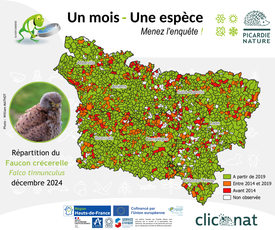 Ce petit rapace est connu sur l’ensemble de la Picardie, affectionnant les milieux agricoles, ce n’est donc pas une surprise . Néanmoins, un grand nombre de communes sont en rouge ou orange, les observations datent donc d’il y a plus de 5 ans, une actualisation est souhaitable. N’hésitez pas à prospecter en priorité les anciennes données afin d’actualiser les connaissances sur cette espèce.