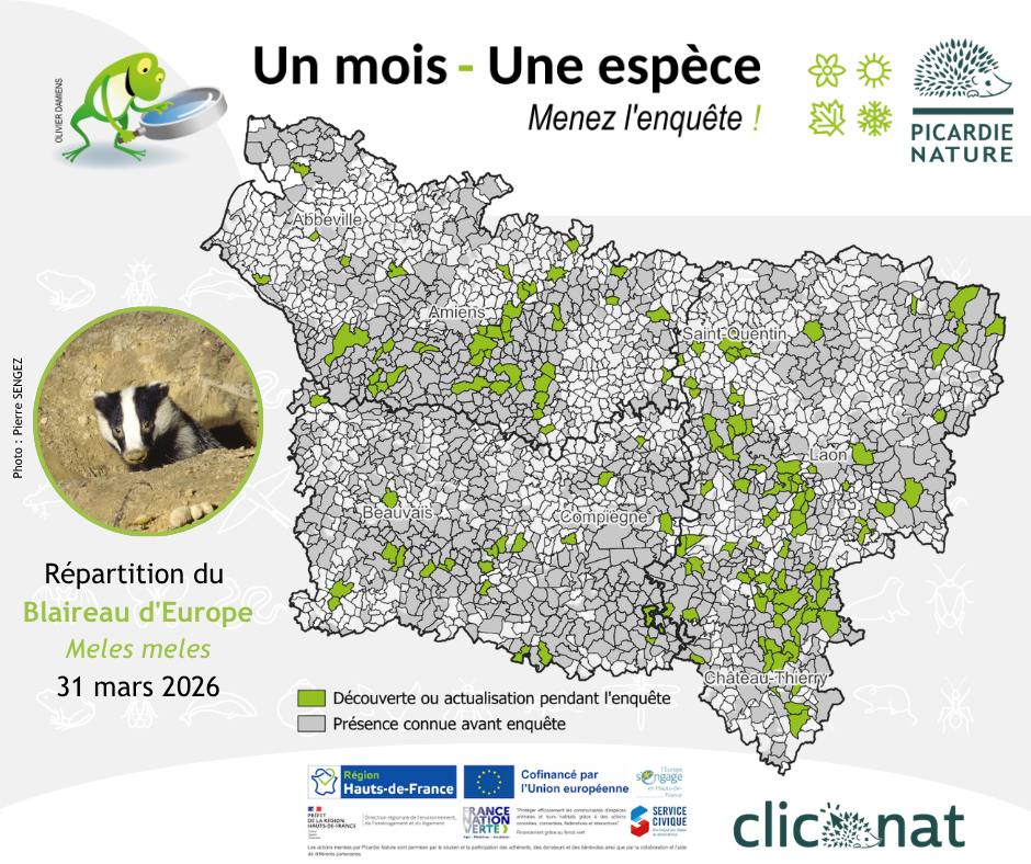 C’est donc sur 148 communes que le Blaireau d’Europe a été noté entre janvier et mars 2026. Si vous observez ce mustélidé à d’autres moments de l’année, vous pouvez toujours nous avertir en saisissant vos observations sur https://clicnat.fr/. En parallèle, d’autres enquêtes vont vous être proposées sur https://citizen.clicnat.fr/fr/home !