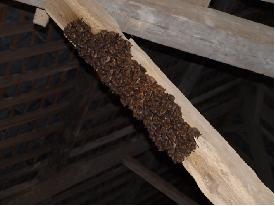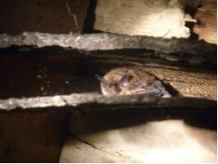 5 Murins à moustaches dormaient paisiblement dans les combles d’un bâtiment administratif du Lycée agricole du Paraclet. Elles se cachaient dans la moindre fissure et cavité de la poutre faîtière et entre les ardoises et les chevrons. Le tas de guano éparpillé le long des combles laisse à penser qu’une colonie est fort probable au sein de ce comble mais les individus sont trop discrets pour se laisser voir.