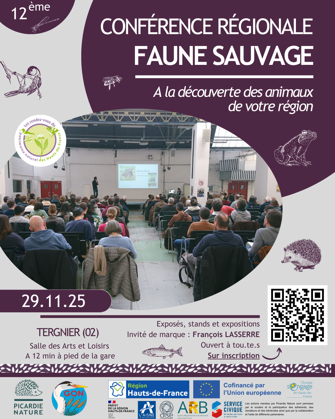 Cette année, Picardie Nature et le GON organisent la 12ème conférence régionale sur la faune sauvage. Nous avons le plaisir de vous inviter à participer à cette manifestation qui aura lieu le samedi 29 novembre à la Salle des Arts et Loisirs (12min à pied de la gare) de TERGNIER (02),