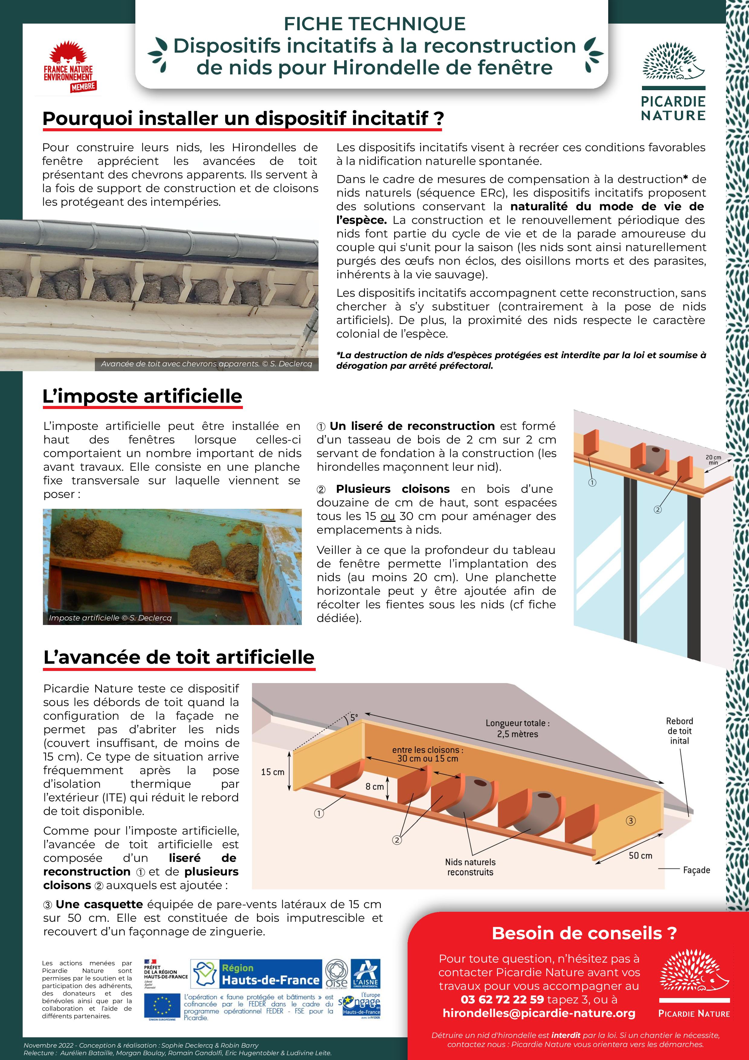 -Également hors de présence des oiseaux (de mi septembre à fin mars), installer des dispositifs pour inciter à la reconstruction. Voici une fiche explicative pour les mettre en place.
